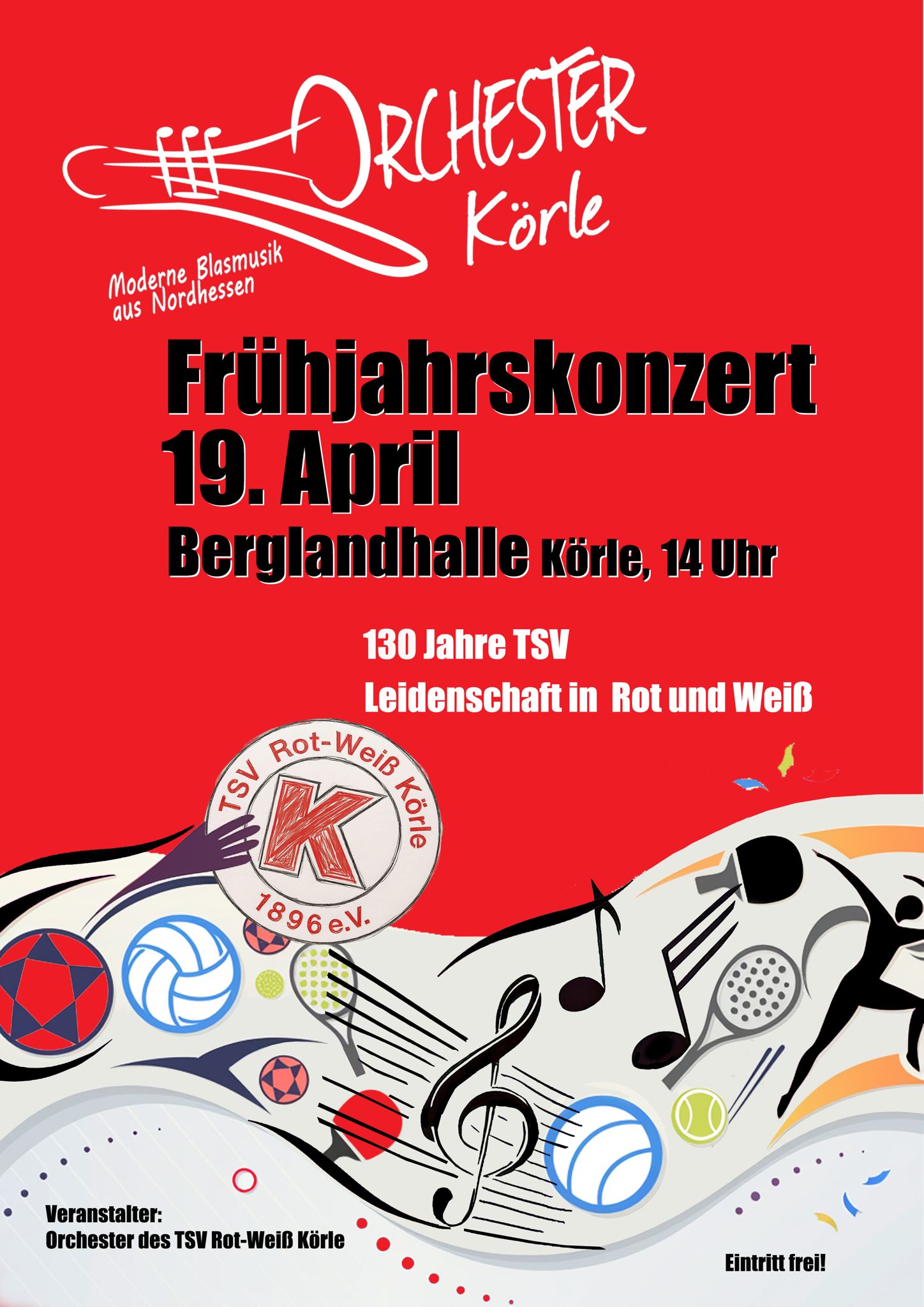Am 19. April um 14:00 Uhr lädt das Orchester Körle in die Berglandhalle Körle ein – und es gibt gleich doppelt Grund zu feiern: 130 Jahre TSV Rot-Weiß Körle! 🥳